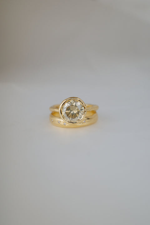 A warm and absolutely radiant diamond ring. Intended as a stacking piece, the solitaire ring's band is slimmer, with the tall diamond sitting proud above our gorgeously wide band intricately dappled with champagne diamonds. Intentionally paired, together, they are an unconventionally versatile show stopper. Their grand size belies a compactness that will suit well both smaller and larger sized hands alike.