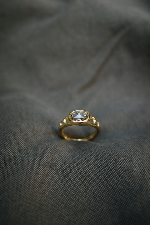 A colourless sapphire rests in a rippling pool of yellow gold. The oval shape of the sapphire is echoed down the sides of the band, with rounded shapes carved down its sides. Texture is painted across the ring in sweeps, giving the whole ring a luminous quality.