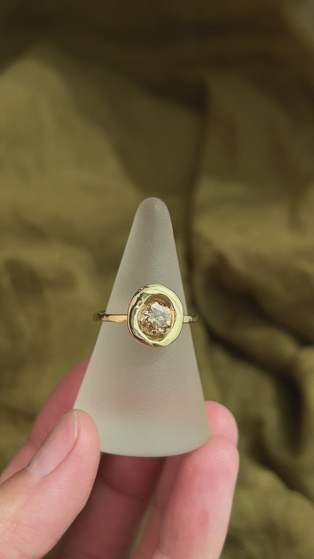 A vibrant, champagne Diamond rests at the brim of a golden vessel. Radiating and bubbling with life, spilling its magic ever so slightly over the edge; a new beginning, endless possibilities. Sculpted by hand in wax, with smooth sweeps of Gold across the surface.
