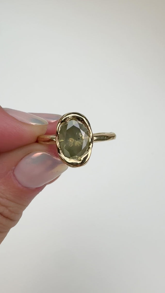 An otherworldly Diamond shifts from silken grey to hints of mossy green and rays of gold as it moves. Waves of liquid gold wrap around the Diamond as if frozen in time. Breaks in the waves let you see through the chalice of gold that holds this Diamond, letting in light to illuminate the stone and show its beauty from every angle. Such a beautiful blend of soft, organic, earthy texture to hold this jaw dropping Diamond.