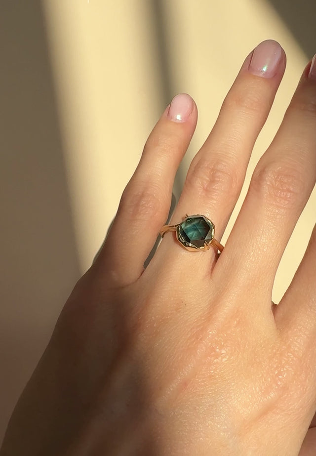 How we love this stunning Sapphire, let us count the ways! Its large, chunky Rosecut facets create windows to the distinct colour throughout the stone. Stunning sweeps of Blue/Green throughout make it change colours from different angles. The sapphire has been precision cut, sourced and cut in Australia. It is held in a unique hand-carved setting with a mix of claws and waves of molten gold. Such a unique and stunning piece.
