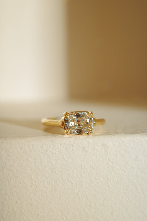 Large open facets of this modern antique old mine cut diamond ring create a pillowy softness to a very classic silhouette. Elegant, eccentric, and overflowing with dreamy romance. Up close, sculptural beads marry band and basket where light swirls of textured gold dance across the surface. Very (under)statement.